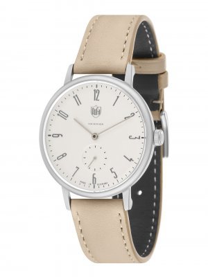 Specifikationer Klocka Modell:DF-9001-0TTillverkare:DuFaTyp:HerrStil:KlassiskDiameter:38 mmTjocklek:8 mmBoett material:Rostfritt stålBoett färg:SilverBaksida boett:Rostfritt stål, pressadArmband material:KalvläderArmband färg:BeigeArmband max handledsomkrets:210 mmUrtavla färg:VitSpänne:BygelspänneGlas:härdat, mineralglasBezel (ring):Fast Specifikationer Urverk Urverkstyp:Batteri (Quartz), MiyotaVattenskydd ATM:3Funktioner:Minut, sekund, timme
