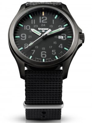 Specifikationer KlockaModell:107422Tillverkare:Traser H3Typ:HerrStil:SportigDiameter:42 mmTjocklek:10 mmBoett material:Rostfritt stålBoett färg:SvartBaksida boett:Rostfritt stål, skruvadArmband material:TextilArmband färg:SvartArmband max handledsomkrets:230 mmUrtavla färg:SvartSpänne:BygelspänneGlas:antireflex, safirglasBezel (ring):FastSpecifikationer UrverkUrverkstyp:Batteri (Quartz), 715, RondaVattenskydd ATM:10Funktioner:Datum, minut, sekund, timme