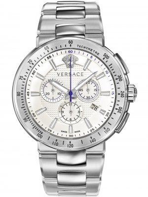 Specifikationer KlockaModell:VFG090013Tillverkare:VersaceTyp:HerrStil:Sportig Diameter:44 mmTjocklek:10 mmBoett material:Rostfritt stål Boett färg:SilverBaksida boett:Rostfritt stål, skruvadArmband material:Rostfritt stål Armband färg:SilverArmband max handledsomkrets:180 mmUrtavla färg:VitSpänne:ViklåsGlas:Safirglas, antireflexBezel (ring):FastSpecifikationer UrverkUrverkstyp:Batteri (quartz) Swiss Made Vattenskydd ATM:5Funktioner:Datum, timme, minut, Kronograf, sekund