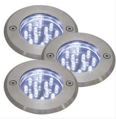 Moderna diodspottar i rostfrittstål för nedgrävning. 12 dioder på sammanlagt 0,7W per spot. Transformator på 10W medföljer satsen med 3 spottar.IP67Tål belastning på 750kg.Nordlux