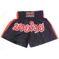 Fighter Thaishorts svart/röda med text.